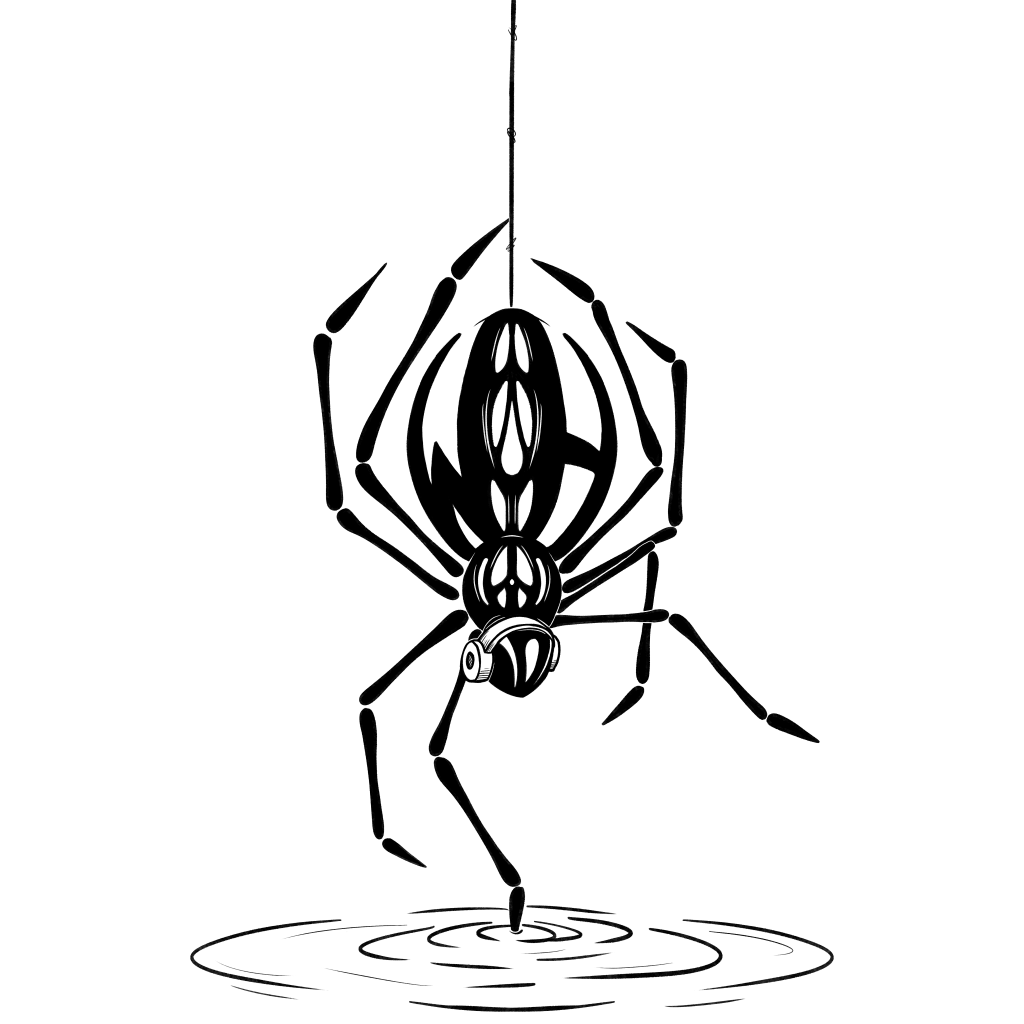 The initial version of this design featured many of the same unique elements, like headphones worn by the spider and ripples reverberating out from its leg lightly dipped in the water. A cartoonish style and rounded details have been updated to bold lines and sleek geometric shapes in Spiderdude 2.0.